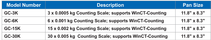 Count efficiently with 1000 item memory and WinCT-Count software, included. With the lower power design, you can run the GC with a USB, AC Adapter or with a battery pack for portable applications. Easily connect to an A&D balance for lower piece weights or hook up to an industrial base for larger parts.